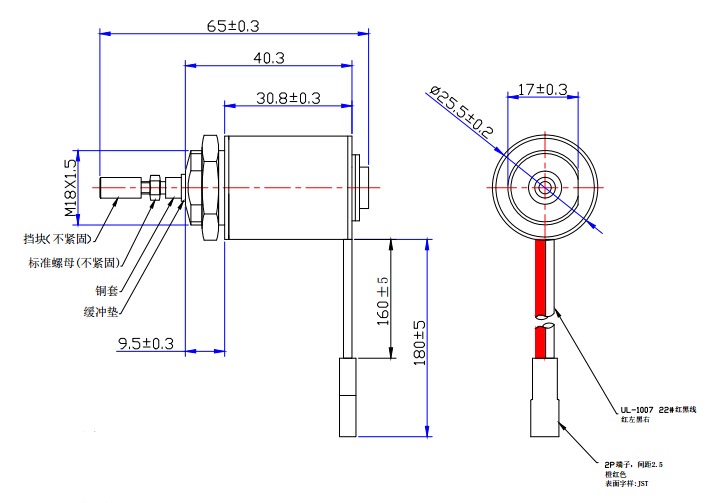 图解:图中标注了电磁铁的结构组成已经尺寸,如果您要求的尺寸和上述要求不同,请您来电洽谈,我们会根据您的要求定制您需要的尺寸和需要的性能。