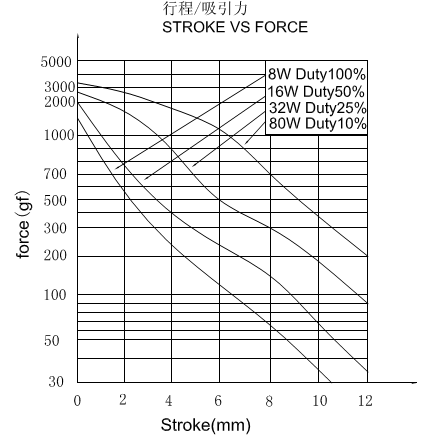 纵向:代表电磁铁在对应行程时的力量 单位为克(g)