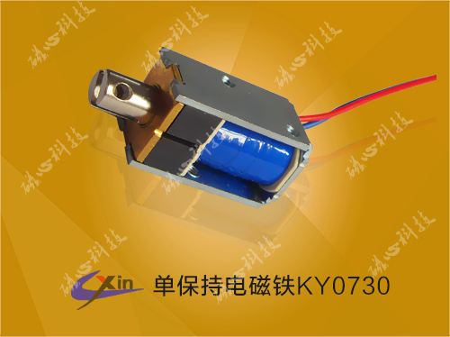 二、单保持电磁铁的原理:保持式电磁铁是有电磁铁线圈、永磁铁、铁芯、轭铁等组成,具有单向保持的功能,电磁铁在静止状态下是靠永磁特的磁力保持在一个位置,当电磁铁通正向电时,线圈产生磁场把电磁铁铁芯弹出(有弹簧保持在另外一个位置),再给电磁铁通方向电,电磁铁线圈产生磁场把铁芯吸到原来的位置。