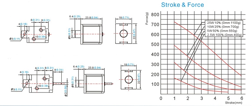 上图所述分别是电磁铁拉式图纸和推式电磁铁图纸,右边描述的是电磁铁行程和力量的曲线图;