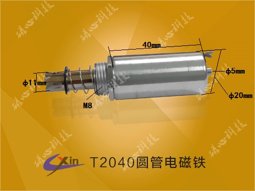 T2040圆管电磁铁直径20mm,高度40mm,采用圆管式结构,产品可以在节省空间的情况下产生较大的推拉力,磁心科技批量生产圆管式电磁铁T2040,具体介绍如下: